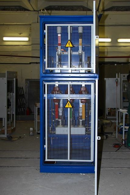 осуществлять его двухстороннее обслуживание, обеспечивает свободный доступ к аппаратуре. Шкаф разделен перегородками на отсек управления, в котором размещается аппаратура и приборы управления, защиты, измерения и сигнализации; и отсеки высокого напряжения, которые комплектуются в зависимости от назначения шкафа.