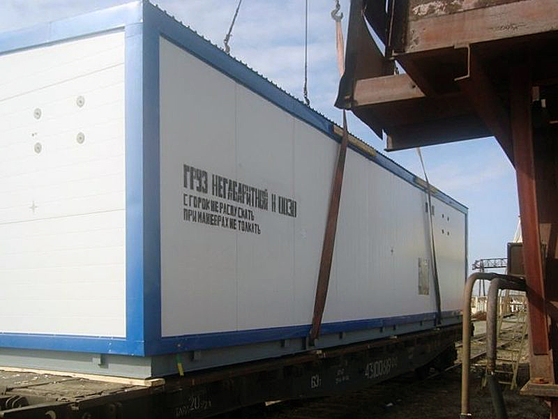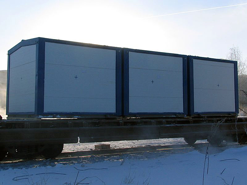 На Фото 1 показаны три блока 3х3 м КТП (утепленной сэндвич-панелями), на универсальной платформе, на Фото 2 - пять блоков 3х3 м на 18-метровой универсальной платформе. Отгрузка на 18-метровой платформе позволяет существенно уменьшить транспортные затраты, так как в противном случае потребовалось бы уже две 13-метровые платформы.