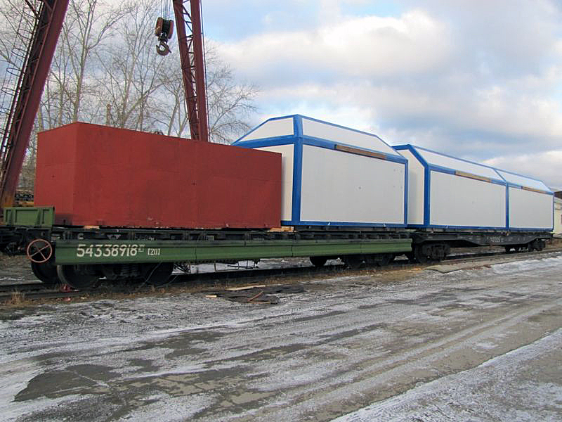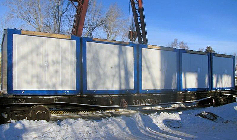 Фото 3 - спарка из двух универсальных платформ с установленными на них 13,5 м блоками. Это максимально возможный габарит груза, который можно отгрузить по железной дороге на универсальных платформах.